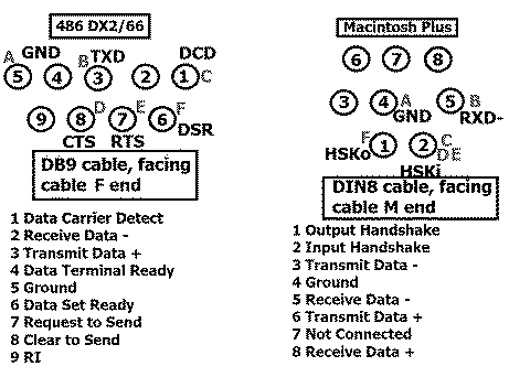 In the supplemental documentation added with v2.0, we can see this paragraph: Goal: serial link multiplayer game between a vintage Mac and vintage PC using a null-modem link between the two! Mac side: Falcon F-16 v2.0 (the update that brought multiplayer for this port) running on a Mac Plus PC side: Falcon (I think you can get away with the original which allows mp out of the box) running on a MSDOS6.22 486 IBM that has a DB9 male serial port. I bought a cable on ebay blindly, it was cheap, and the wiring doesn't look promising. this is the diagram of how the pins are linked together on both ends of the cable I think a potential solution is: cable 1: Mac DIN8 male to DB25 male regular printer cable cable 2: PC DB9 female to DB25 female null modem cable <- not easy to find or perhaps cable 1: Mac DIN8 male to DB25 male regular printer cable cable 2: PC DB9 female to DB9 male null modem cable dongle 1: DB9 female to DB25 femal I definitely need help from people more knowledgeable about these null-modem solution, bonus points if you've done cross platform connections with RS422 and RS232!