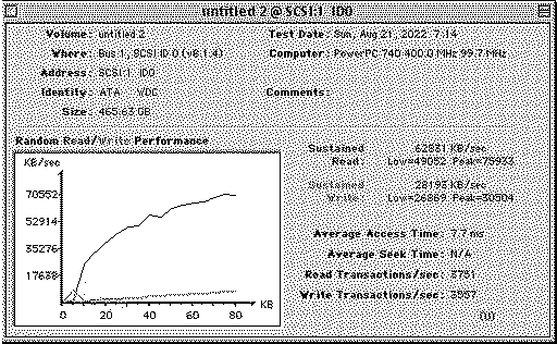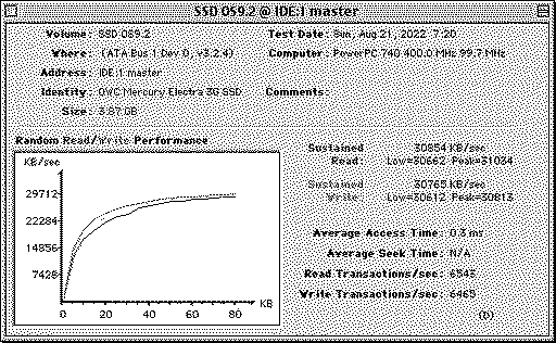 I got 60-plus MB/s read performance and about half that for write. (Ignore the FWB BenchTest write performance graph that's mucked up for some reason.) For comparison, my main boot drive is a 120GB OWC SSD in the (33MHz) ATA bus running through an IDE to SATA adapter: The FWB BenchTest hung doing seek tests which I hence needed to disable. I presume this was related to the specific drive or driver and not the SATA card itself because that's fine with older, smaller drives. The big drive boots OS9 fine and HFS+ is OK with it .. but some classic apps and utilities may be freaked out by the size.