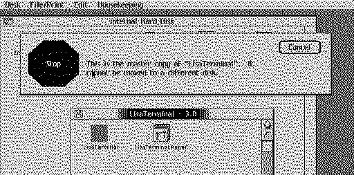 ^^^ This is the solution! ^^^ Ah, that is the trick! I had no idea you couldn't just "copy" (which I believe in LOS is actually a move) an app off the floppy. So you are correct, the proper way to install an app from a floppy disk (real or emulated) is to select the application, press Command-D (or select Duplicate from the File menu). You will be greeted with a blinking "duplicate" of the original, which you can drag to your hard drive of choice. At that time, it will ask you if you want to serialize the copy of the software. That means that floppy can only then be used for running / installing on the Lisa with your serial number. Early piracy prevention at its finest! Thank you so much for that awesome suggestion! I now have the entire suite of Lisa software on my hard drive and can remove the ridiculously long floppy cable running out the back of the Lisa! |