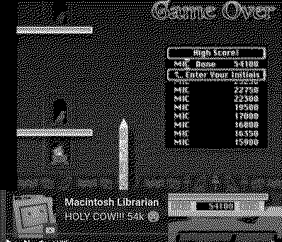 -shattered the 25k barrier I had -shattered the 30k barrier -beat Gruz' score of 37,950 -crossed over 40k -crossed over 50k!!!! it's all captured in real time over at Dave's: timestamp when I join in: (around 9900s or 165m) Even got a reaction from Maccy (Macintosh Librarian)
