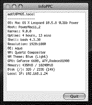 A few weeks back i created small neofetch based app for 10.4 - 10.6. You can download it here: https://macintoshgarden.org/apps/infoppc