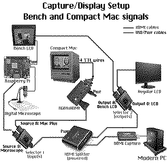 Use case #1:Clone my Mac Plus signal to a HDMI capture stick, a small lag is acceptableClone that signal to a LCD screen, sub 1-frame lag is needed here. This is what I've been using ever since I build my own RGBtoHDMI early in 2022, to great success (you can check that out here Use case #2:Plug a digital USB microscope into a standalone raspberry pi 3a and have it display the output on a small 8" Eyoyo LCD screen on the bench where it's neededBonus: pi3a's only usb plug is used by a single USB hub to power the LCD screen and the scope Bonus: a single button press powers them all up Bonus: it autoboots into the scope view (a webcam type of app for Rasbian) within 2 minutes of booting Bonus: also send the signal to my HDMI capture stick so I can get zoomed bench footage and record/stream it Unneeded use case #3if I select the Mac Plus output and send it to my benchUnneeded use case #4if I select the scope+ pi3a output and send it away from my bench