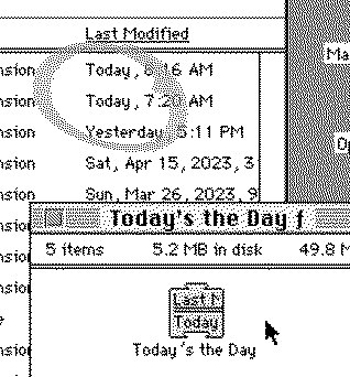 Here's a new little utility INIT for Systems 6/7 (and probably much earlier versions): Drop this in your System Folder (or Extensions folder under System 7) so that the Finder will show files modified today or yesterday as "Today" or "Yesterday" just like Mac OS 8. Works in both Finder list views and the Get Info window. It's quick and easy and at least a tiny bit nice. (Technical note - it only patches DrawString and DrawText in the Finder's application heap, so won't slow down anything else at all.) Inspired by this episode of Mac Folklore Radio, wherein Derek reads David Pogue praising Mac OS 8 in part due to this simple feature. Now it's available in Systems 6/7! https://macfolkloreradio.com/2023/03/03/desktop-critic-mac-os-8.html It can be localized for non-English by just changing STR resources #128 and 129 in the INIT file with ResEdit. Written in THINK C 6. At some point in the future I will make the source code available, but I want to spiff it up some first. (And figure out how to use GitHub, I'm still stuck in the '90s) Download at: https://macintoshgarden.org/apps/today-s-the-day