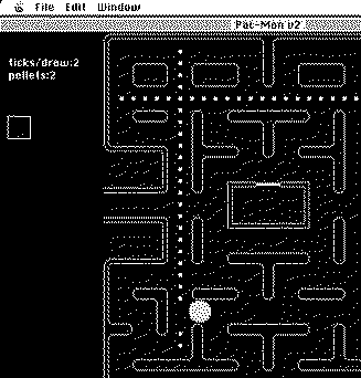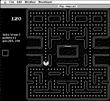 1) new Window menu item: DeveloperView toggle 2) no longer redrawing entire screen for every frame. Now in the offscreen PixMap we draw the entire frame once (startup, window size switching, & updates) and then only draw moving rects (previous location and new location) in subsequent frames. Then we transfer the whole image over to the gameWindow using CopyBits 3) we have the first row and column of pellets so that I can start to figure out spacing, collisions with, and variable storage of all the pellets 4) we have Pacman movement and animation frames. Current keys are: W,A,S,D and/or I,J,K,L 5) no walls or paths yet. He continuously moves but bounces off game borders. 6) we have pellet collision testing and erasure