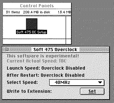 @Mr. Fahrenheit very kindly alerted me to a very surprising discussion at the other forum which introduces a groundbreaking discovery by Mustermann. Apparently, you can now overclock an LC 475, CC Mystic and other machines by software alone, without even using Spicy O'Clock, from @Kay K.M.Mods (Kero's Mac Mods). Here's a screenshot of the machine compatibility from the installer app: When you download the software overclocker BIN file (created by Phipli) and then put it on your vintage Mac and use Stuffit Expander to decompress it, the installer app will look like this: It installs a Control Panel and an Extension: No mention is made of software compatibility, but most likely it works on System 7.1 through 7.5.5. (I made these screenshots in Basilisk II booted into System 7.5.5.) Once installed, you can set the clock speed in the Control Panel (which then requires a restart): There's even a "Custom" selection in the popup menu that allows you to see higher clock frequencies: If you try a clock speed too high for your Mac and it freezes, just reboot with SHIFT held down to prevent the CP and Ext. from loading. This and more is described in the installer app's README text. So be sure to read that completely before installing it. It's not clear if VRAM speed is as important as it is when you overclock with Spicy, but I suspect it is. Having a 68040 with full FPU will also impact your performance and probably overclockability too. Heatsinking at high clock speeds is still important. Another thing that is not clear is how serial ports and SCSI are impacted. In my own testing of Spicy, serial ports stop working when the CPU is overclocked higher than 43.48MHz. (I confirmed serial ports don't work at 43.7MHz when using Spicy.) DISCLAIMER: I've not tested this software overclocker on my Color Classic Mystic yet (which still has Spicy O'Clock installed). @Mr. Fahrenheit has tested it though and confirmed it overclocked his CC Mystic to 40MHz. It's not clear if he tested clock speeds higher than that. The great thing about this solution is that (1) there's nothing to buy to try it, and (2) you just reboot with SHIFT held down if you overclock too high. Have fun! P.S. If you find it useful, I recommend sending a word of thanks to Mustermann and Phipli at the other forum, as well as thank Mr. Fahrenheit for his testing and involvement.